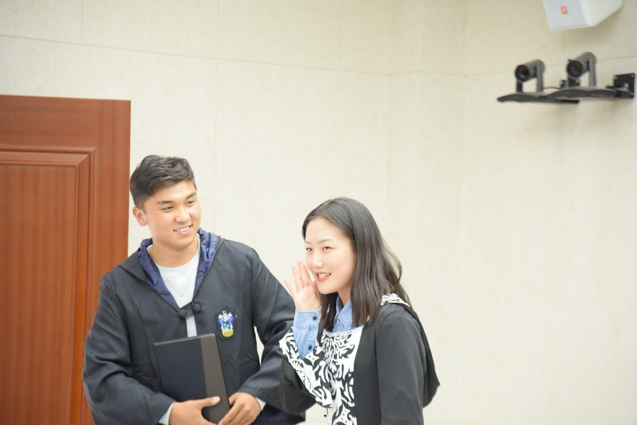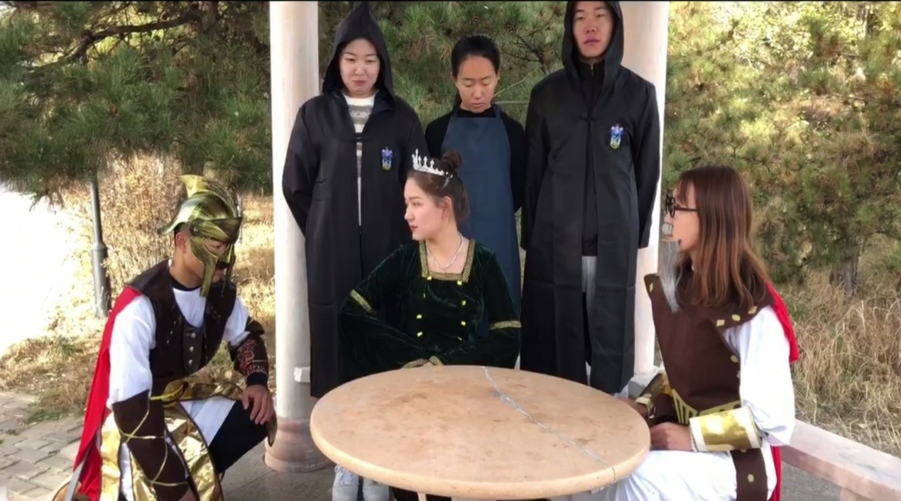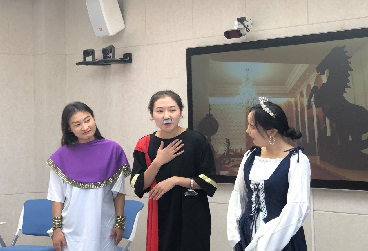 本次实践课以世界文学经典戏剧作品为主题,选择英国著名剧作家莎士比亚的《哈姆雷特》、《奥赛罗》和法国喜剧作家莫里哀的《伪君子》、《吝啬鬼》等四部剧作为实践课内容。学生在阅读理解上述作品的基础上,在外国文学史任课教师朝鲁孟其木格的指导下组建导演、编剧组、演员组、道具组、技术组,最终以微视频和舞台剧形式呈现。2018级1班柴拉干、乌尼日其其格、哈斯其木格、其乐木格等主演的舞台剧《吝啬鬼》和2018级2班西吉勒旁白,德格金、萨日盖、阿丽娅、格根哈斯等主演的舞台剧《伪君子》将吝啬鬼阿巴贡和伪君子答尔丢夫的形象生动再现,同时突出戏剧的喜剧特征。2018级2班德格金执导,邰清泉、金圆圆、阿丽娅、额登苏日德等主演的微视频《哈姆雷特》和2018级1班乌日查呼执导,曹敦、哈伦、香梅、巴亚力格、韩智光等主演的微视频《奥赛罗》不仅呈现原著的悲剧性,而且运用新技术,增加新元素令人耳目一新,印象深刻。课间两个班分别进行才艺表演活跃了课堂气氛。